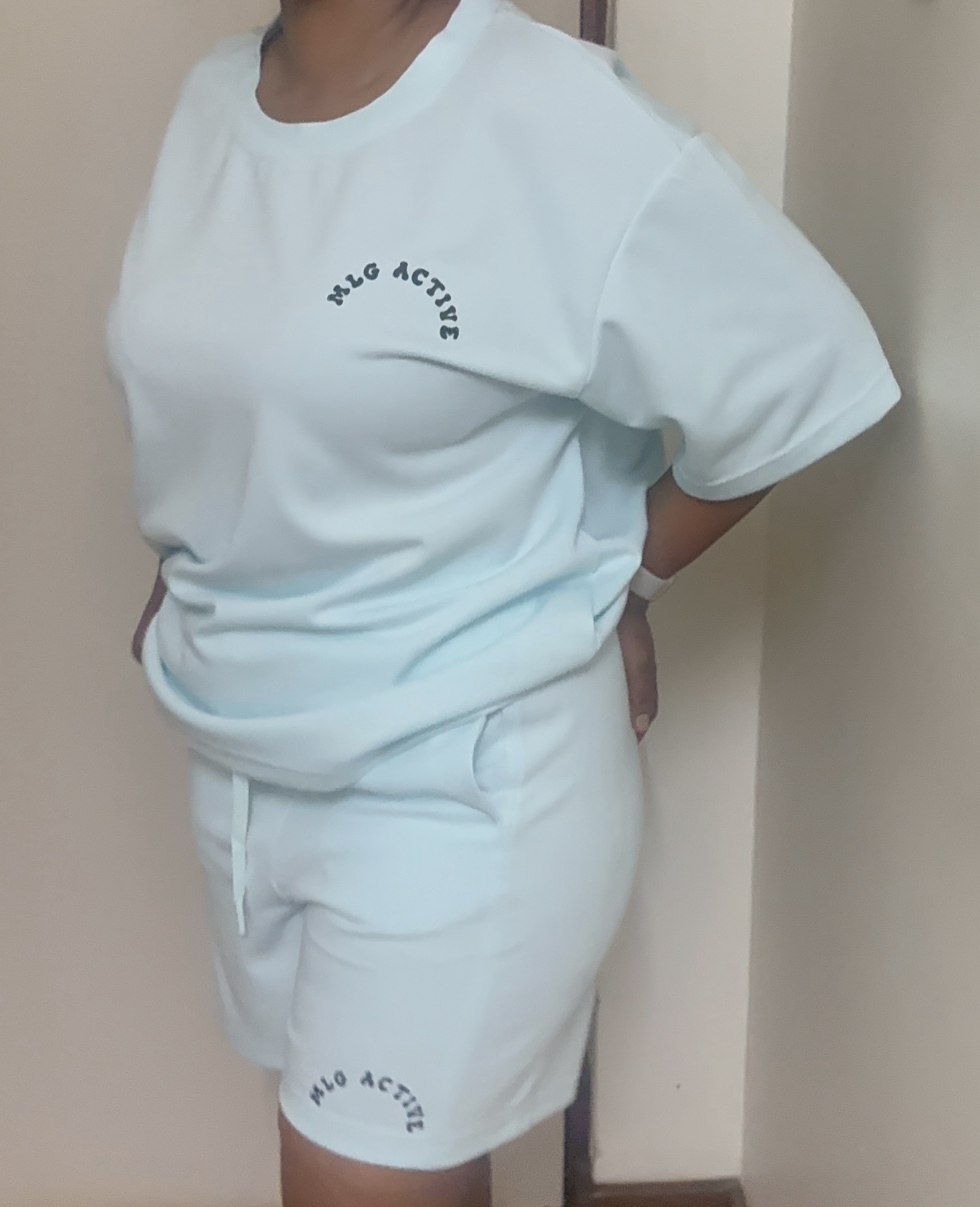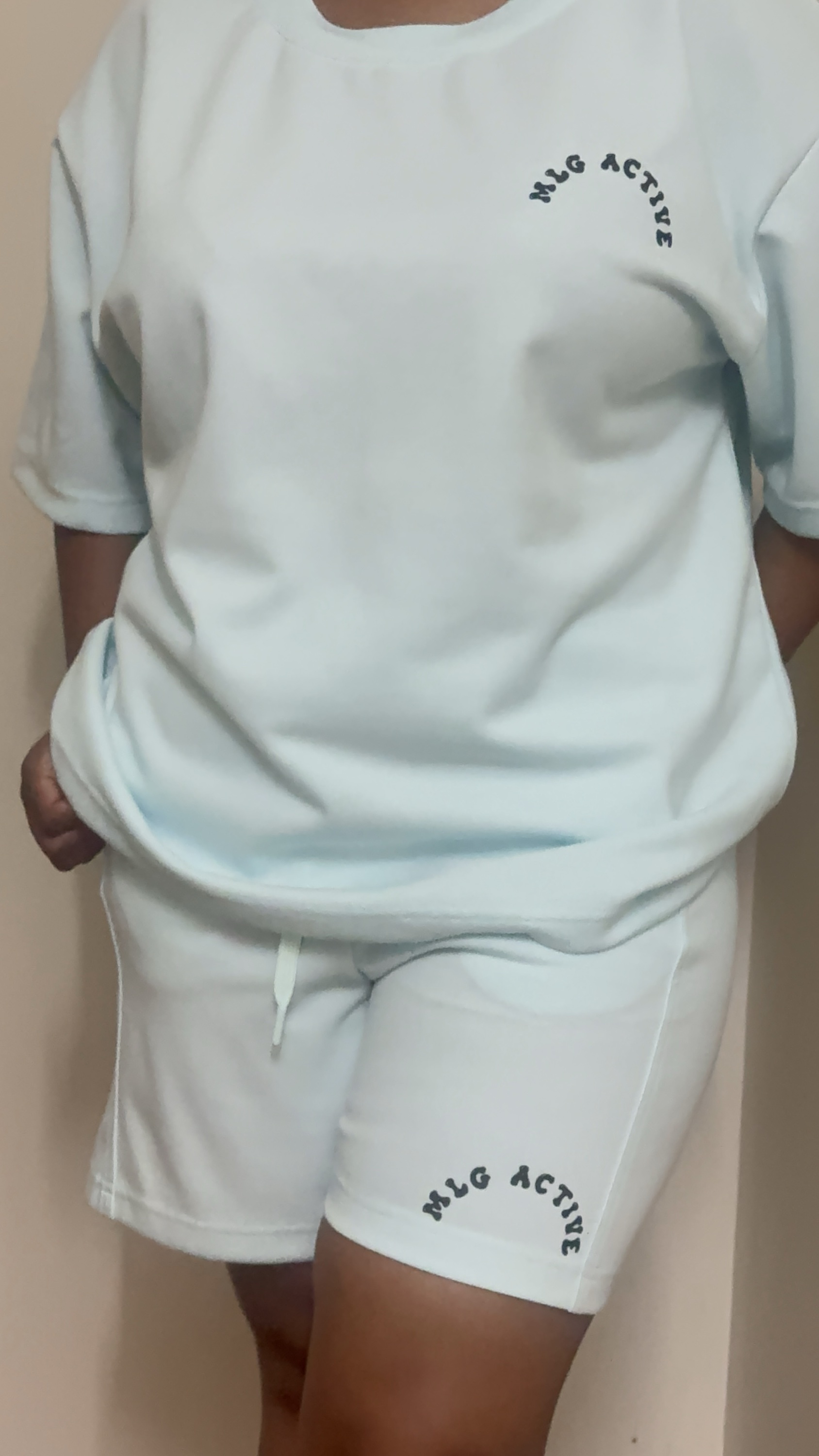 Elevate your activewear collection with the MLG Active Shorts and T-Shirt Set. Crafted for ultimate comfort and freedom of movement, this two-piece ensemble is made from a soft, breathable fabric that keeps you cool and dry whether you’re hitting the gym or relaxing at home. The oversized t-shirt features a subtle “MLG ACTIVE” logo on the chest, while the matching shorts have an adjustable drawstring waist for a secure, personalized fit and a small logo detail on the leg. The tranquil light blue color adds a fresh, modern touch to your wardrobe. This versatile set is designed to be your go-to for any activity, blending effortless style with functional design.
